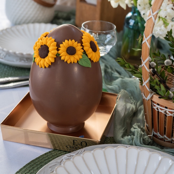 Большое пасхальное яйцо высотой 18 см отлито из молочного и белого бельгийских шоколадов и украшено красивой ветвью цветущей яблони!