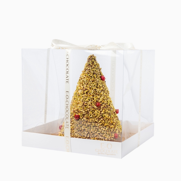 Елка отлита из молочного бельгийского шоколада, украшена жареной соленой фисташкой. В составе подарка 12 конфет ручной работы.